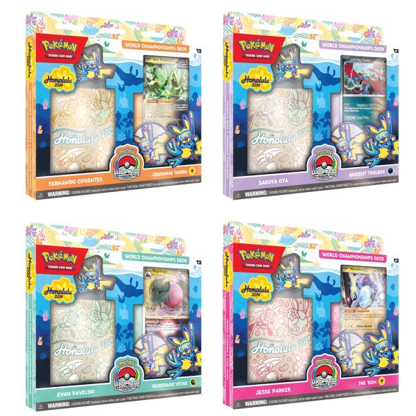 ¡Consigue un mazo del Campeonato Mundial y juega como un verdadero campeón! Elige uno de los cuatro poderosos mazos, cada uno una réplica exacta, carta por carta, de los mazos utilizados por contendientes reales del Campeonato Mundial 2024 del Juego de Cartas Coleccionables Pokémon.